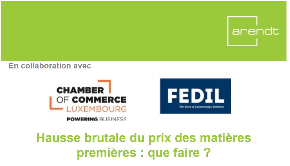 Arendt & Medernach en collaboration avec la FEDIL et la Chambre de Commerce organise un seminaire sur le thème "Hausse brutale du prix des matières premières : que faire ?" qui se déroulera dans la salle C1 de la Chambre de Commerce lundi 11 juillet 2022 à partir de 12h.