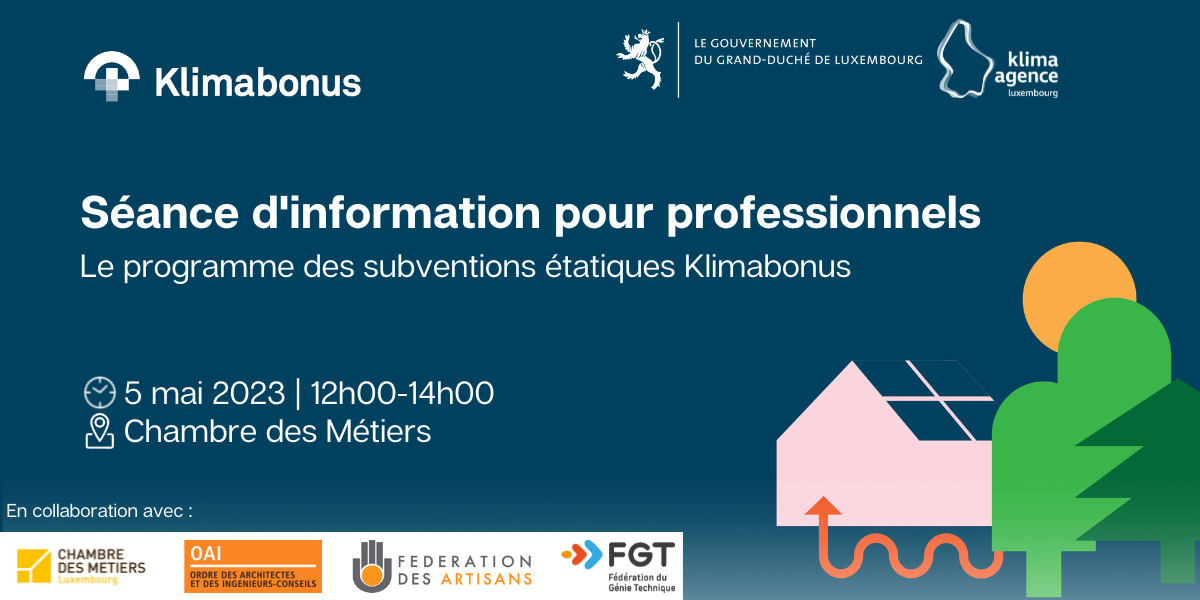 Klima-Agence, ensemble avec le ministère de l’Énergie et l’Aménagement du Territoire, le ministère de l’Environnement, du Climat et du Développement Durable, le ministère du Logement, la Chambre des Métiers, la Fédération des Artisans, la Fédération du Génie Technique et l’OAI, vous invite à une séance d’information sur le programme de subventions étatiques Klimabonus pour la promotion de la durabilité, de l'utilisation rationnelle de l'énergie et des énergies renouvelables dans le domaine du logement.